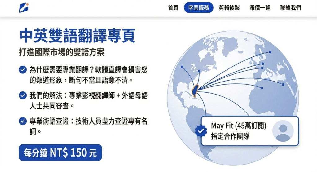 - 知名創作者指定: 我們是 May Fit (45 萬訂閱) 等多位知名創作者的中英雙字幕御用翻譯團隊。