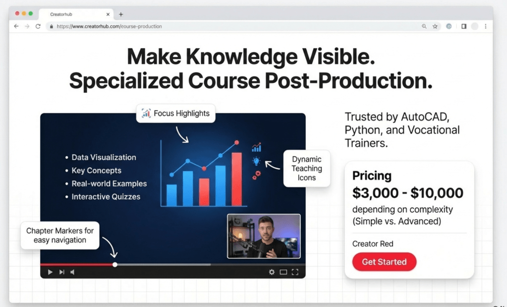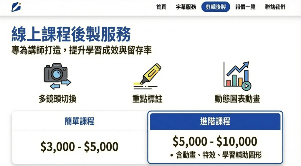 | 包含內容 | 剪接授課片段、添加簡單過場、100% 人工字幕製作。 | 多鏡頭切換、課程重點標註、動態教學圖示、圖表動畫與動態字幕。 |