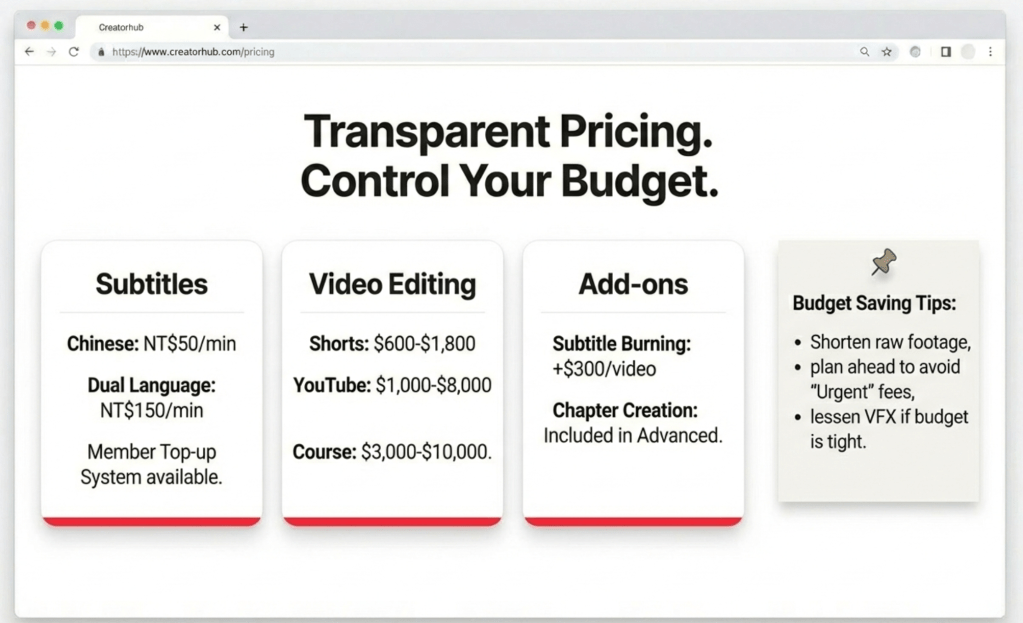 - 基礎剪輯:$1,000 ~ $3,000 元