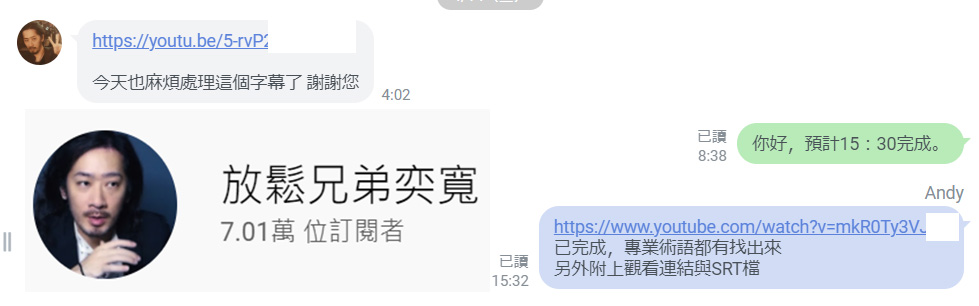 您可以先提交一段影片,加入我們的line帳號。我們會在完成中英文字幕通知您。您可以再來考慮是否與我們合作,完全沒有負擔。